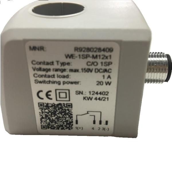 Incorporated within the WE-1SP-M12X1 are reed contacts that respond to magnetic field changes, allowing for precise operation with one or two switching points. The temperature suppression function ensures reliable performance by discharging excess temperature through the housing of the mechanical/visual indicator. It's important to note that this electronic switching element is not compatible with WOS.PA type indicators made from polyamide but offers modular flexibility and cold start signal suppression capabilities for other systems. While it comes with mating connector options (WESPMx), these connectors are not included with delivery. Alternatively, there is also a version available with plug-in connections (WESPEN). Overall, Bosch Rexroth's WE-1SP-M12X1 provides an advanced solution for monitoring and maintaining hydraulic systems efficiently and reliably across various applications where precise control and maintenance indication are crucial.